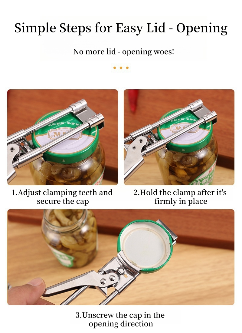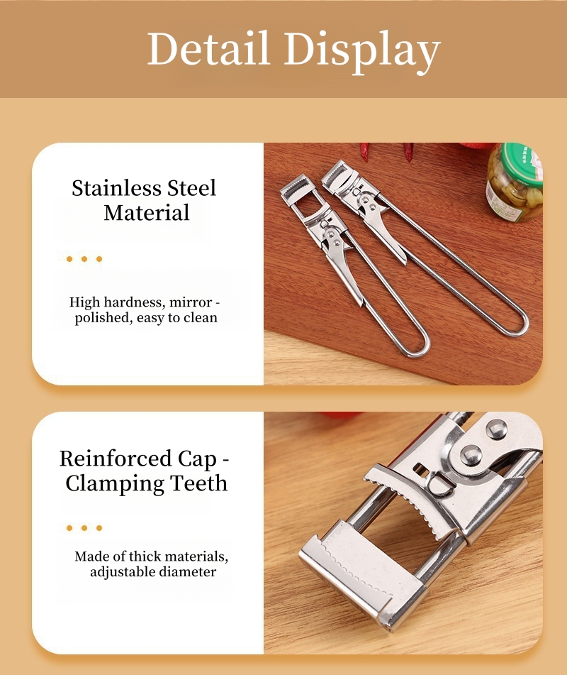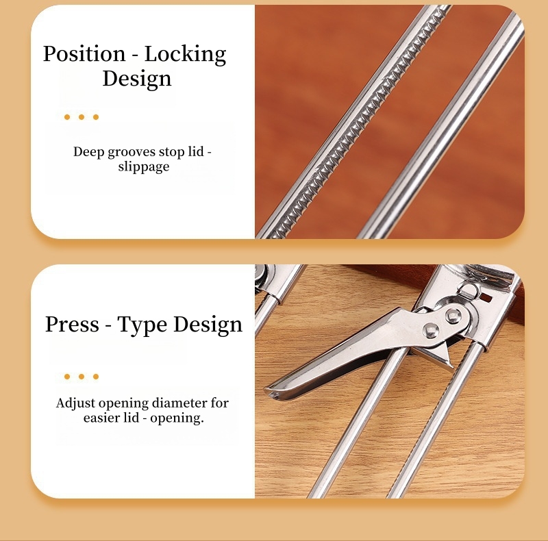This is an adjustable, multifunctional stainless - steel can opener. We offer two sizes: 19.7 cm and 23 cm. It features an adjustable mechanism that adapts to various lid diameters, with a maximum capacity to open lids up to 11.2 cm in diameter.