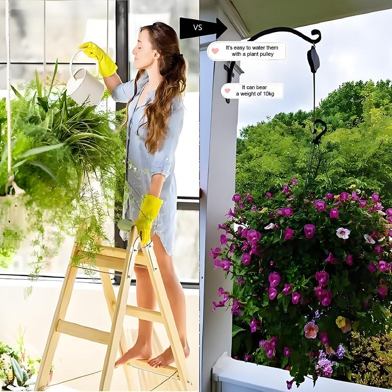Easily raise and lower your hanging baskets with our retractable plant pulley. Perfect for watering, feeding, pruning, or cleaning—without unsafe ladders or messy spills.